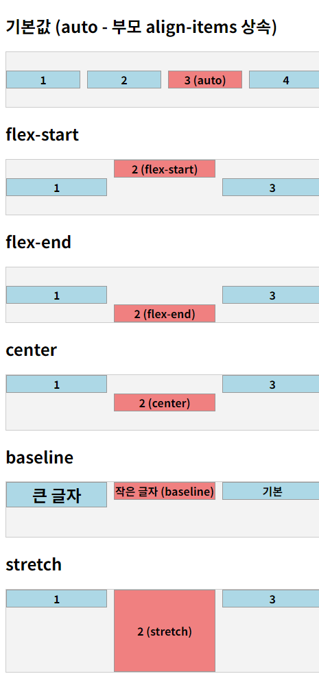 | auto (기본값) | 컨테이너의 align-items 값을 그대로 따름 - 개별적으로 설정하지 않으면 align-items와 동일 |