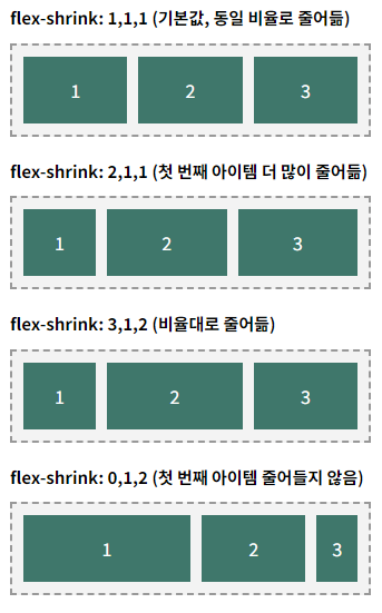 | initial | flex: 0 1 auto | CSS 기본값, 늘어나지 않고 줄어들 수 있음 |