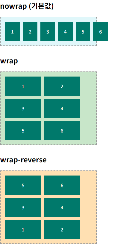 | nowrap | 한 줄로 배치, 컨테이너 너비/높이 초과 시 잘림 | 기본값, 줄 바꿈 없음 |